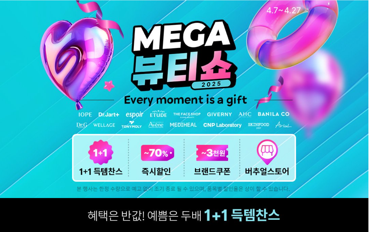 이번 쿠팡 메가뷰티쇼는 2025년 4월 28일까지 진행되는 대형 뷰티 할인 프로모션이에요. ‘화장품계 블랙프라이데이’라고 불릴 정도로 브랜드 폭이 넓고 할인율이 파격적이에요.